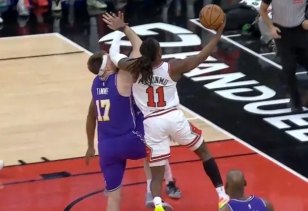 第二节比赛中,蒂米被打到面部走回更衣室,裁判回看吹多森姆普通进攻犯规。